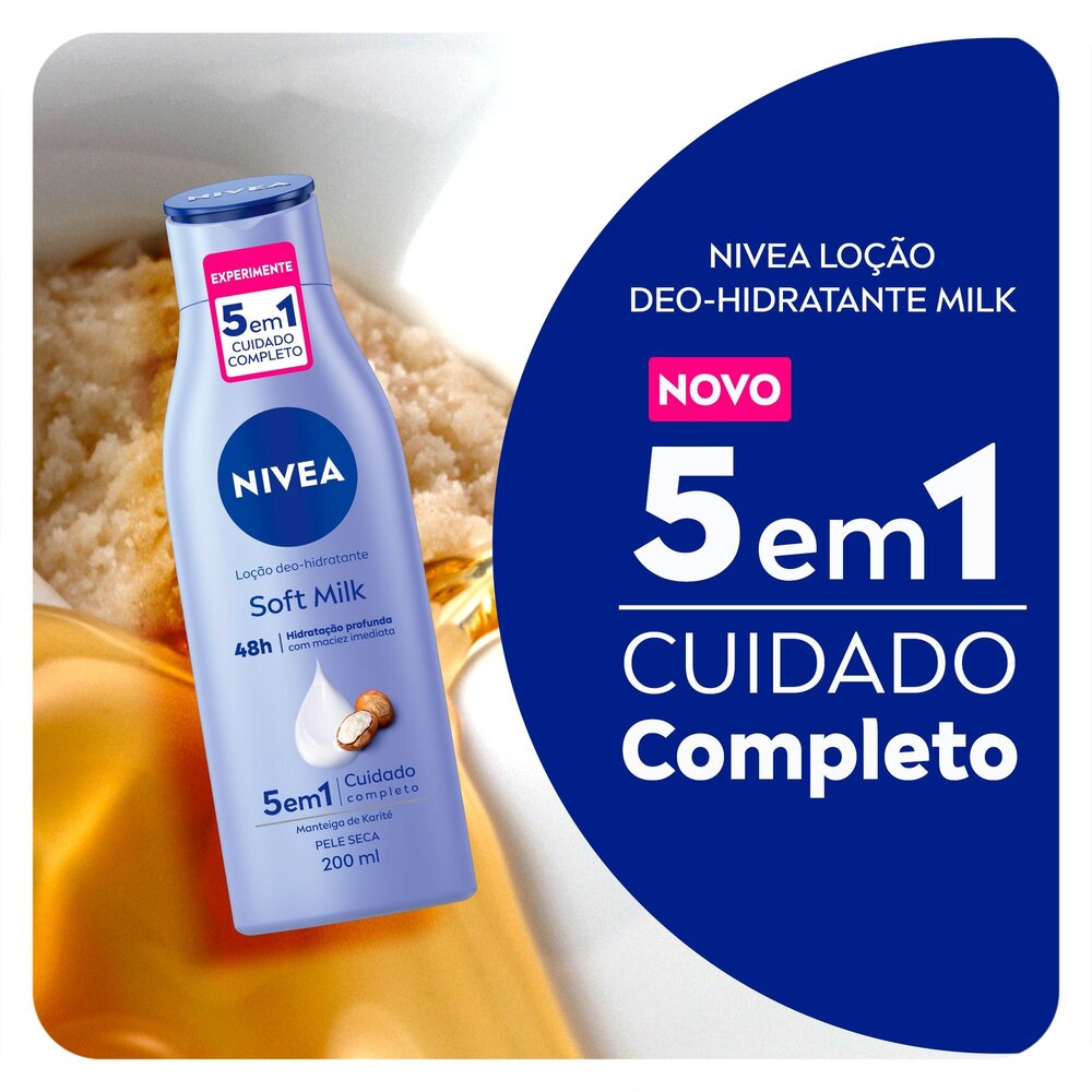 Caixa com 1 unidade - "Enriquecido com Manteiga de Karité, NIVEA Soft Milk proporciona hidratação prolongada para a pele seca e desodoriza a pele.