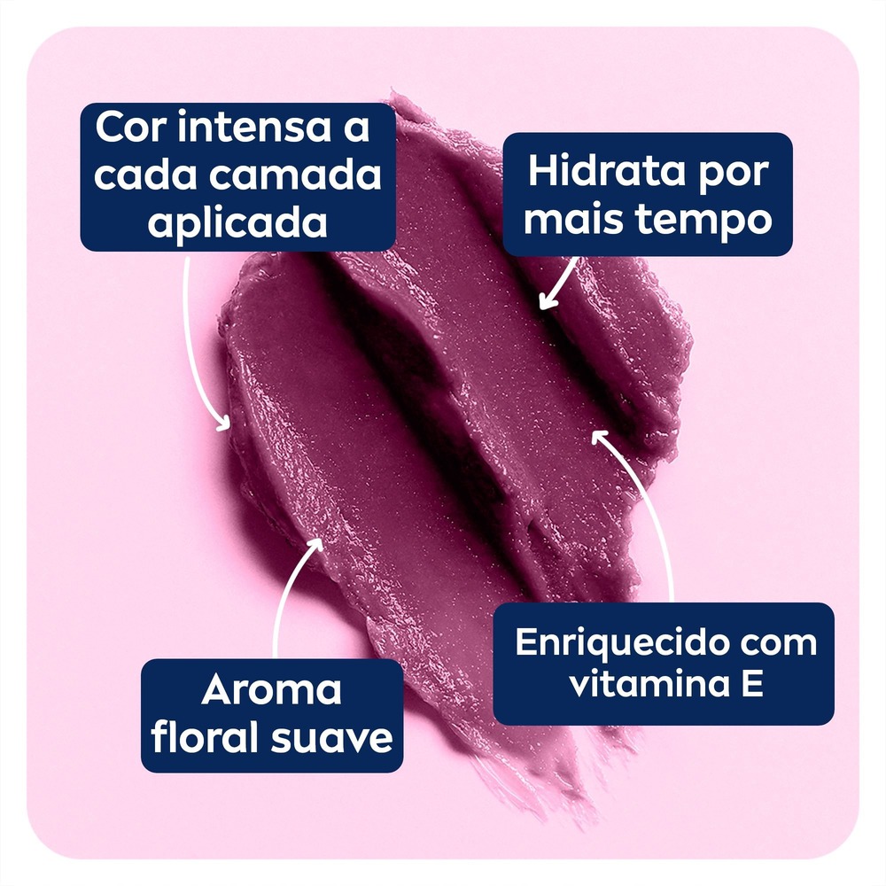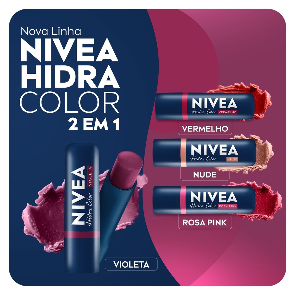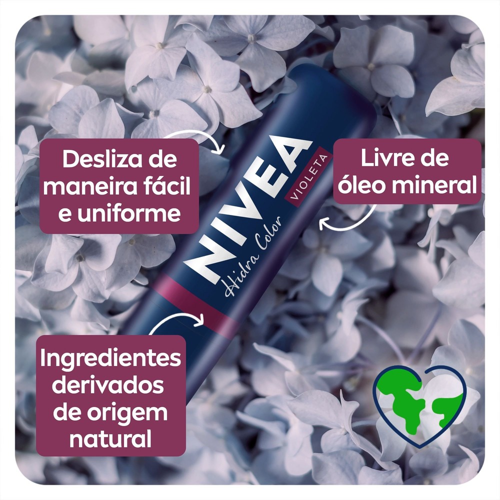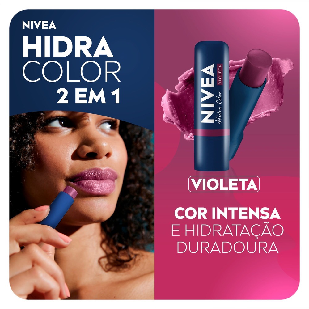 NIVEA Hidra Color Violeta combina cor intensa com o cuidado confiável de NIVEA. Com fórmula livre de óleo mineral, NIVEA Hidra é enriquecido com manteiga de karité, óleo de amêndoas orgânico, vitamina E. Com acabamento violeta intenso, tem aroma floral suave especialmente desenvolvida para o uso diário.