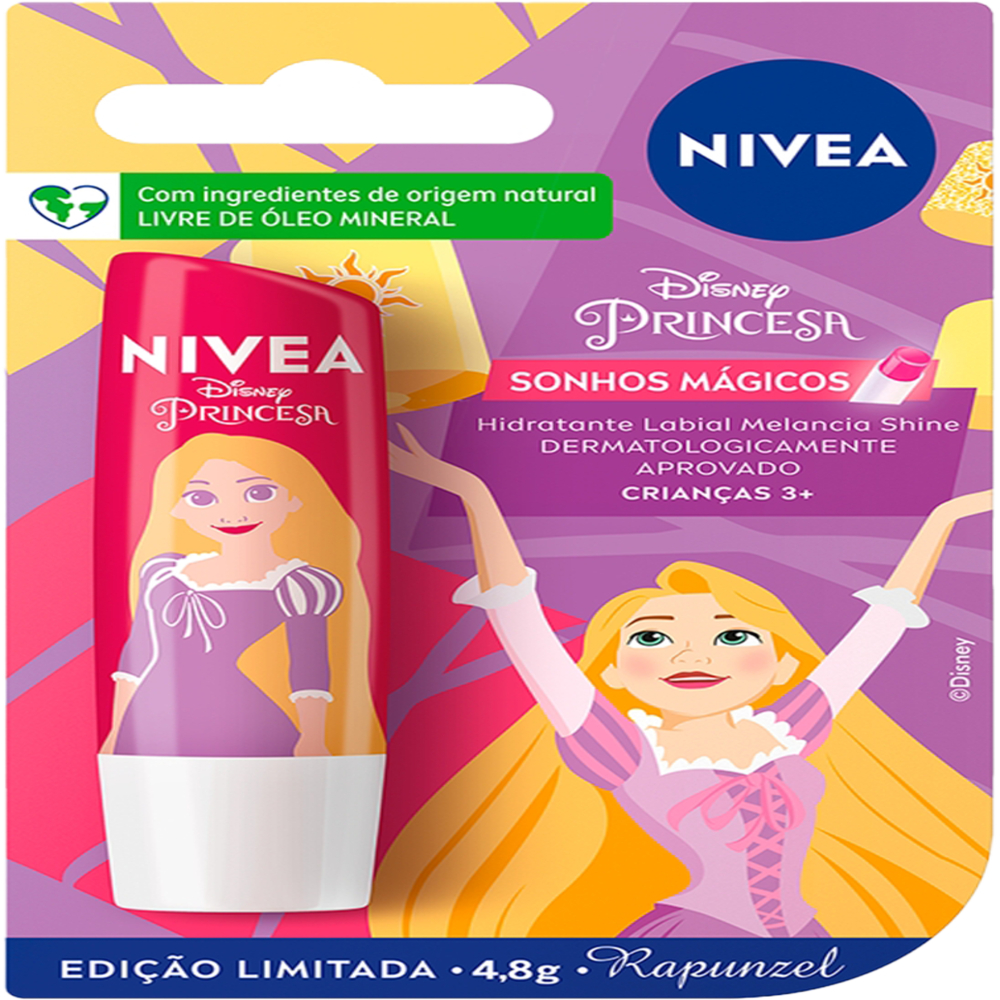 Chegou a hora de brilhar junto com o novo NIVEA Hidratante Labial Melancia Shine, Edição Limitada Disney da Rapunzel! Com uma fórmula produzida à base de óleos de origem natural, o novo hidratante labial NIVEA hidrata por 24h e protege contra o ressecamento. Com cheirinho delicioso de melancia e um toque sutil de brilho com cor, deixa o sorriso pronto para espalhar magia por onde for.