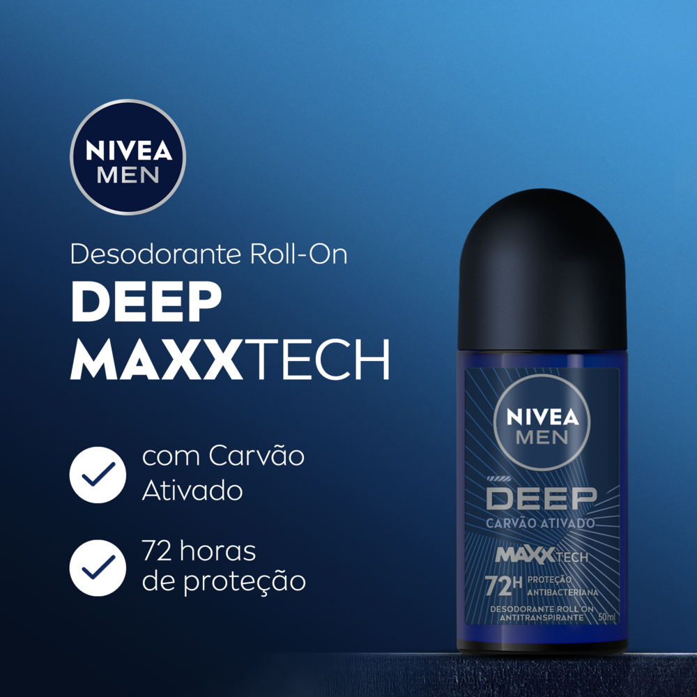 NIVEA MEN Antitranspirante Roll-on Deep MaxxTech Carvão Ativado protege contra suor e mau odor. São 72 horas de proteção com uma fragrância duradoura e exclusiva. Sua tecnologia com carvão ativado promove uma poderosa proteção contra bactérias reduzindo-as em até 99,9%*.