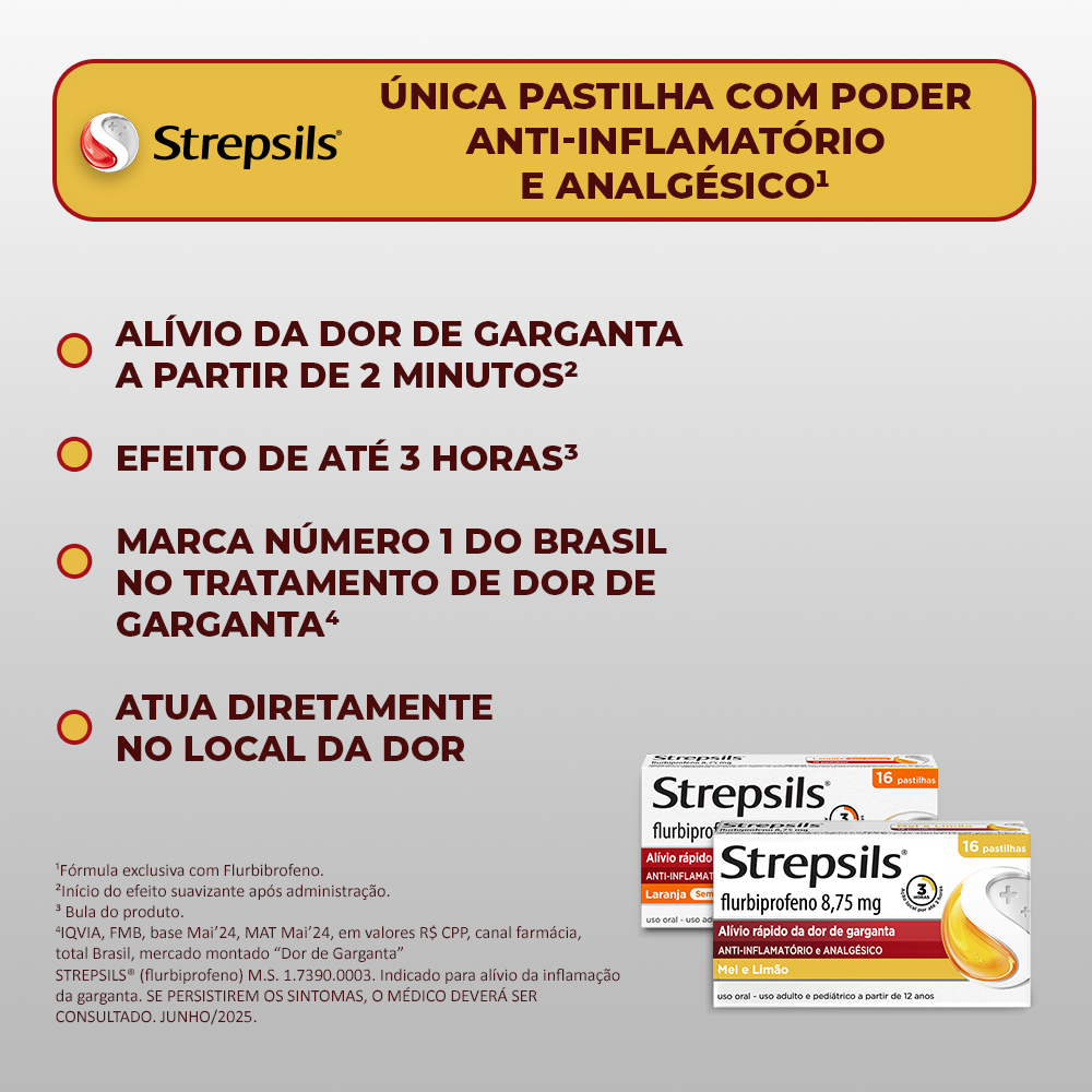 Strepsils é a única pastilha para dor de garganta com flurbiprofeno, que possui poder anti-inflamatório e analgésico e traz alívio da dor a partir de 2min, por até 3 horas.