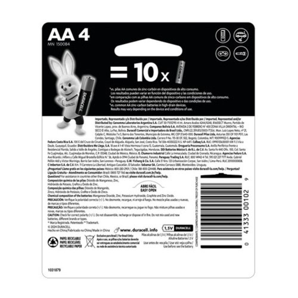 As pilhas alcalinas Duracell® estão disponíveis em uma enorme variedade de tipos e tamanhos, garantindo sempre o produto certo para diversas situações. Ideal para controle remoto, despertador, brinquedos e outros. Contém 4 unidades de pilha AA.